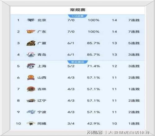 卫冕冠军广厦队和青岛队都是6胜1负位居第三、四名;