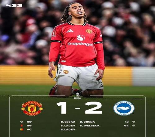 易边再战,维尔贝克爆射破门,布莱顿在客场2球领先,随后,B费角球助攻,谢什科头球破门。比赛的尾声阶段,曼联小将莱西不满判罚砸球发泄,裁判出示第二张黄牌将其罚下。最终,曼联在主场1-2不敌布莱顿,惨遭淘汰。