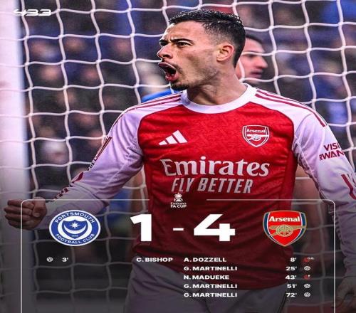 不过,枪手并没有自乱阵脚,凭借角球得分的优势,先后取得破门,半场2-1反超比分。易边再战,马丁内利完场帽子戏法,最终,枪手客场4-1逆转击败朴茨茅斯,晋级足总杯下一轮。