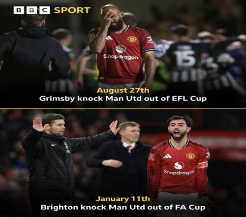 本赛季英联杯第二轮,曼联在点球大战中被英乙球队格林斯比淘汰。如今,曼联在足总杯第三轮被布莱顿淘汰。